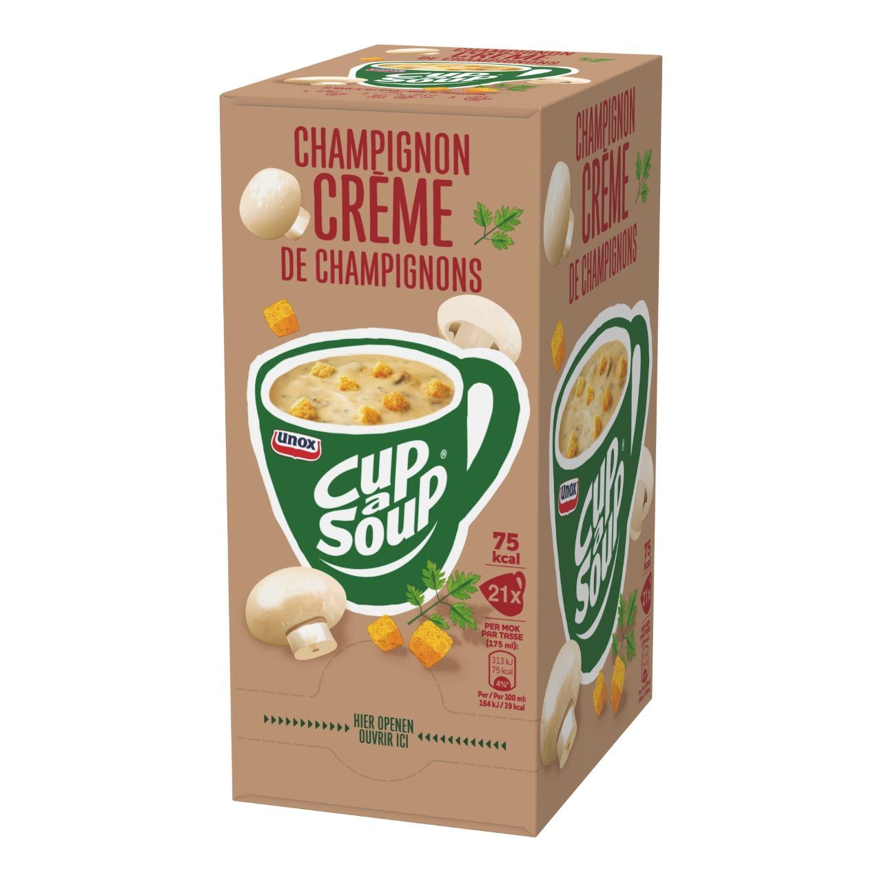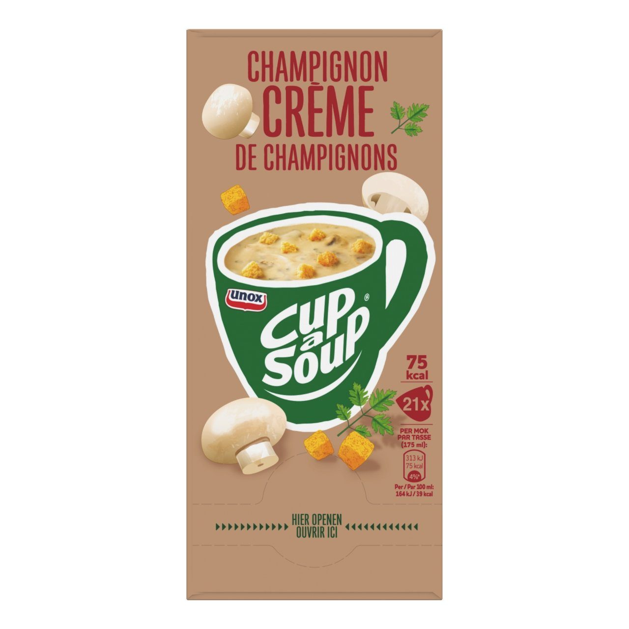 Geniet van een heerlijke Cup-a-Soup Champignon Crรจme, gemaakt van de beste ingrediรซnten en zonder smaakversterkers, kunstmatige kleurstoffen en conserveermiddelen. Niet alleen lekker om vier uur, maar ook tijdens de lunch of op een ander moment van de dag. Dit hartige tussendoortje geeft u een boost in energie. Heerlijk voor op de werkvloer, op school of thuis op de bank. Deze verpakking bevat 21 zakjes Cup-a-Soup voor een kop soep van 175 ml.