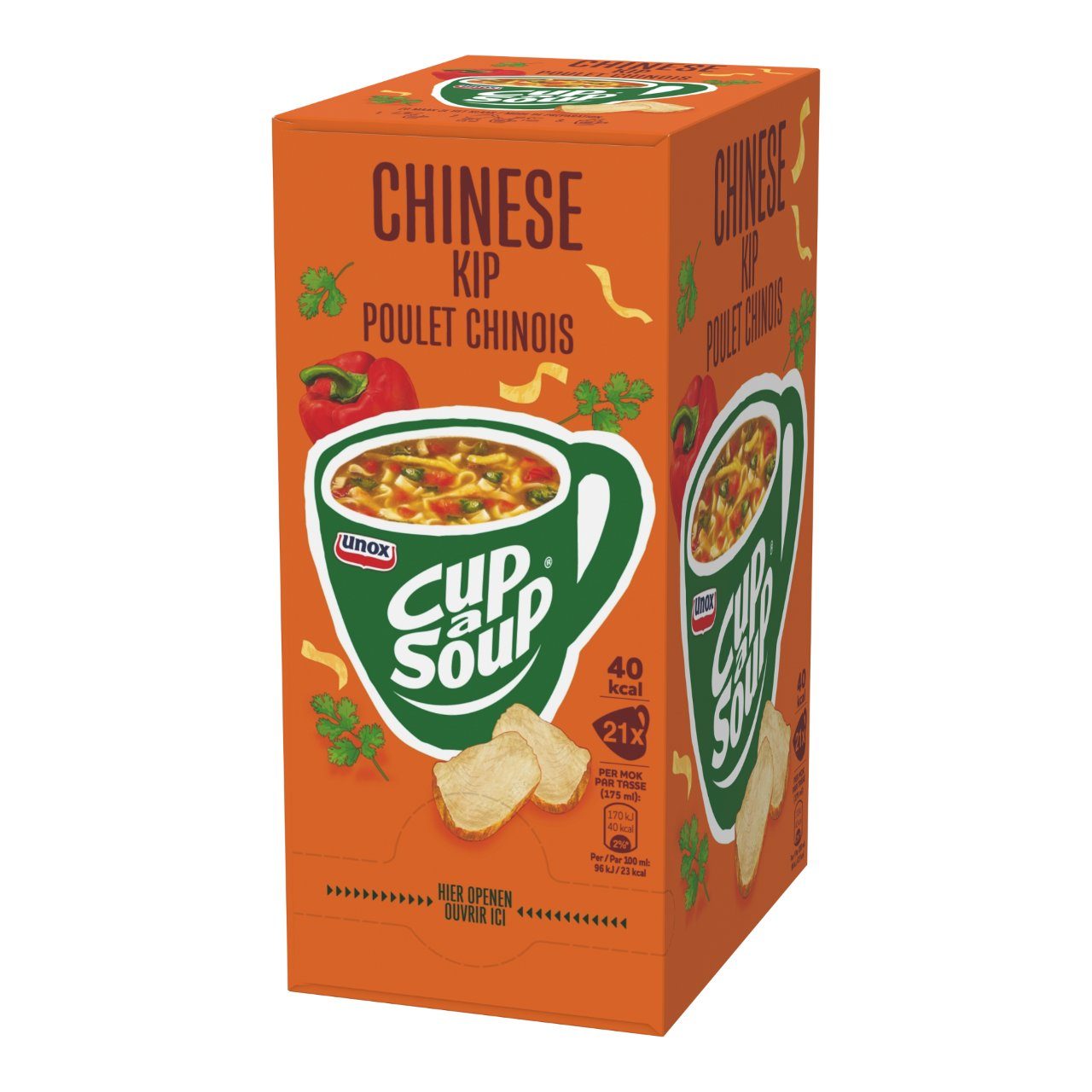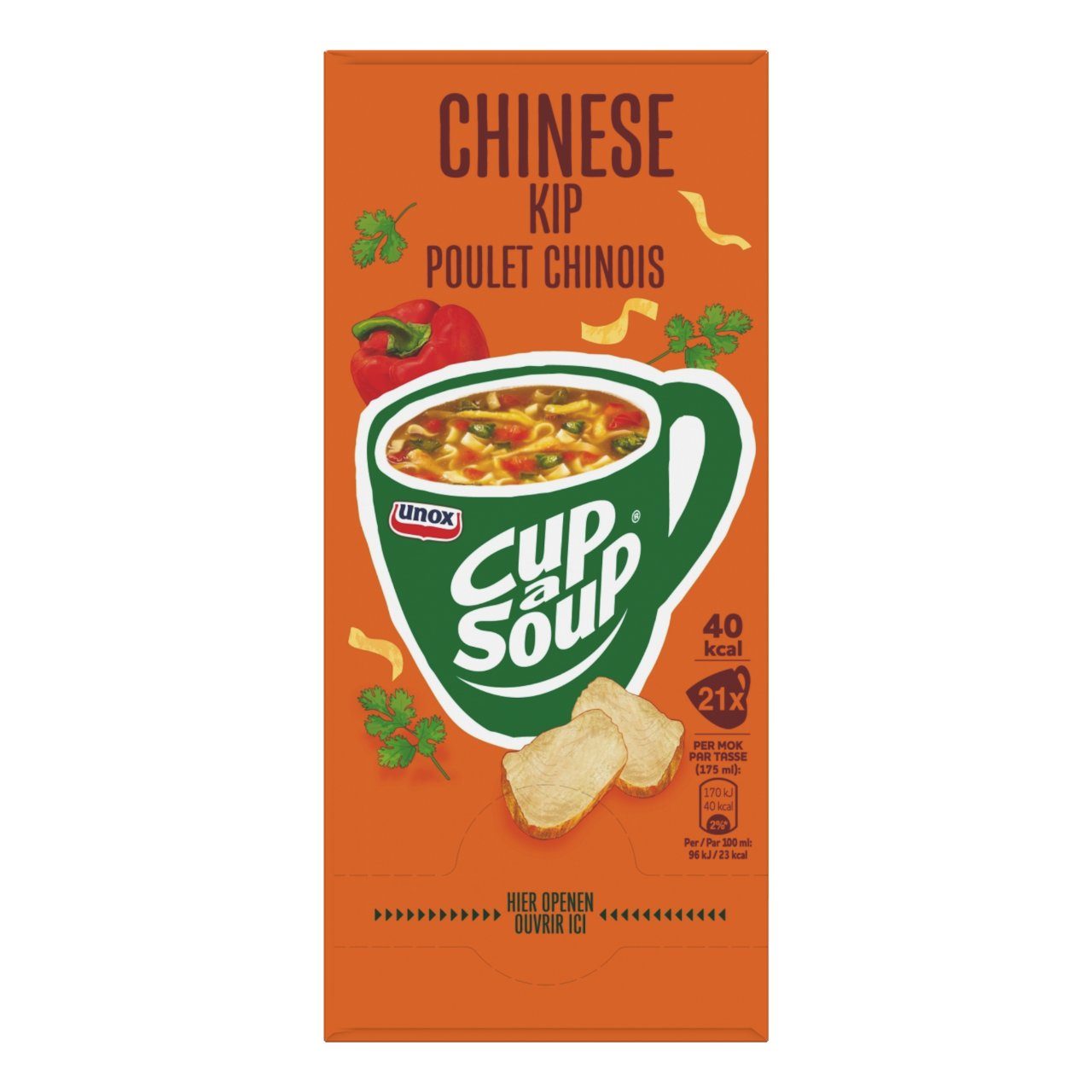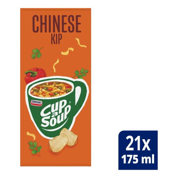 Geniet van een heerlijke Cup-a-Soup Chinese Kip, gemaakt van de beste ingrediรซnten en zonder smaakversterkers, kunstmatige kleurstoffen en conserveermiddelen. Niet alleen lekker om vier uur, maar ook tijdens de lunch of op een ander moment van de dag. Dit hartige tussendoortje geeft u een boost in energie. Heerlijk voor op de werkvloer, op school of thuis op de bank. Deze verpakking bevat 21 zakjes Cup-a-Soup voor een kop soep van 175 ml.