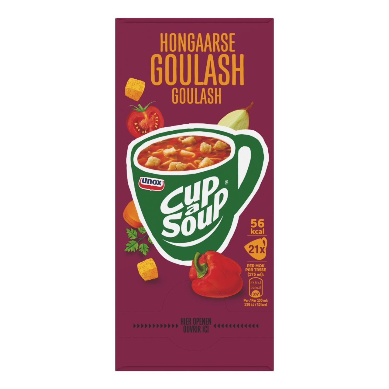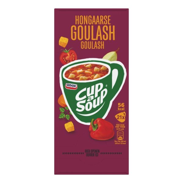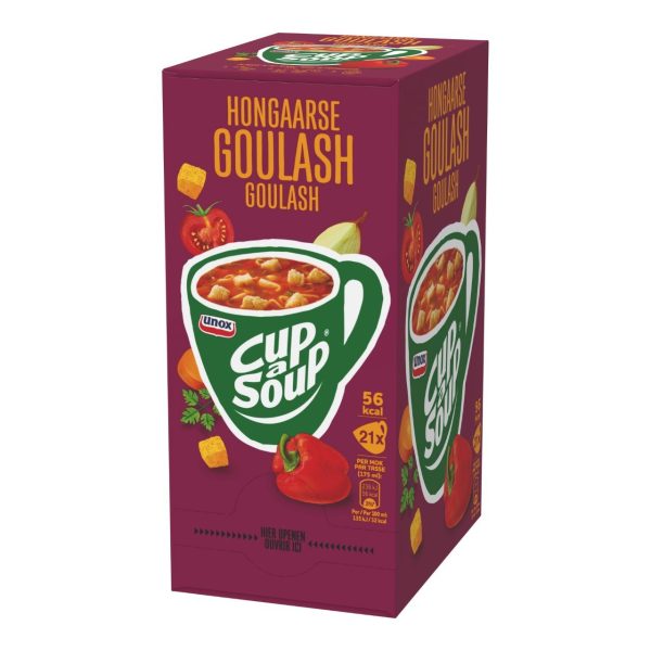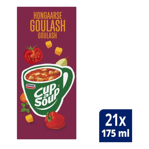 Geniet van een heerlijke Cup-a-Soup Hongaarse Goulash, gemaakt van de beste ingrediรซnten en zonder smaakversterkers, kunstmatige kleurstoffen en conserveermiddelen. Niet alleen lekker om vier uur, maar ook tijdens de lunch of op een ander moment van de dag. Dit hartige tussendoortje geeft u een boost in energie. Heerlijk voor op de werkvloer, op school of thuis op de bank. Deze verpakking bevat 21 zakjes Cup-a-Soup voor een kop soep van 175 ml.