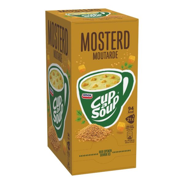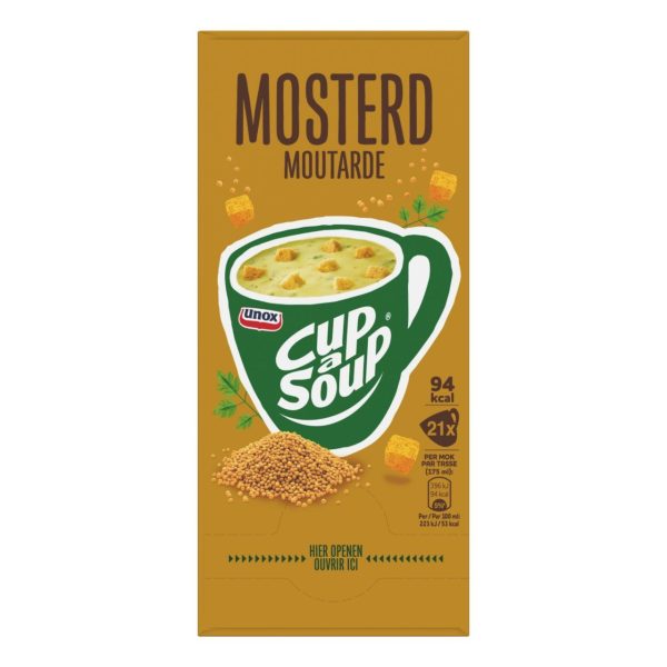 Geniet van een heerlijke Cup-a-Soup Mosterd, gemaakt van de beste ingrediรซnten en zonder smaakversterkers, kunstmatige kleurstoffen en conserveermiddelen. Niet alleen lekker om vier uur, maar ook tijdens de lunch of op een ander moment van de dag. Dit hartige tussendoortje geeft u een boost in energie. Heerlijk voor op de werkvloer, op school of thuis op de bank. Deze verpakking bevat 21 zakjes Cup-a-Soup voor een kop soep van 175 ml.