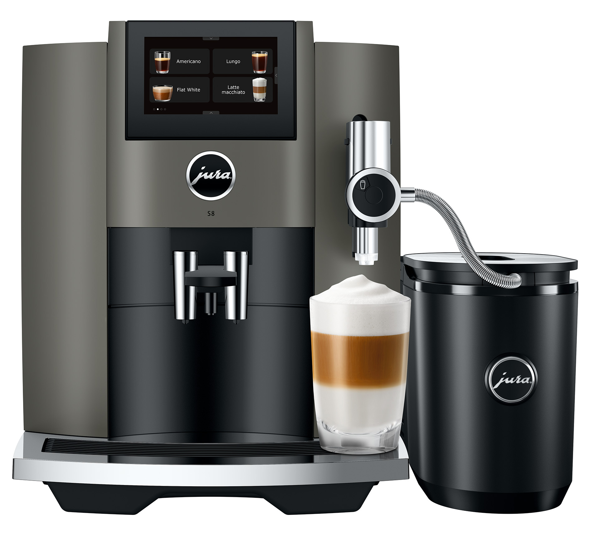 Het innovatieve bedieningsconcept van de S8 is ook eenvoudig te begrijpen. Je kunt intuรฏtief over het royale 4.3″ grote touchscreen swipen om door alle bedienings- en programmeerstappen te navigeren. Het gebruik van afbeeldingen en animaties als leidraad maakt de navigatie volledig zelfverklarend en toont alle stappen van de bereiding. Het schermontwerp harmonieert met de heldere, expressieve designtaal en de eenvoudige gebruikersinterface maakt een duidelijke en gemakkelijke bediening van de volautomaat voor koffiespecialiteiten mogelijk.