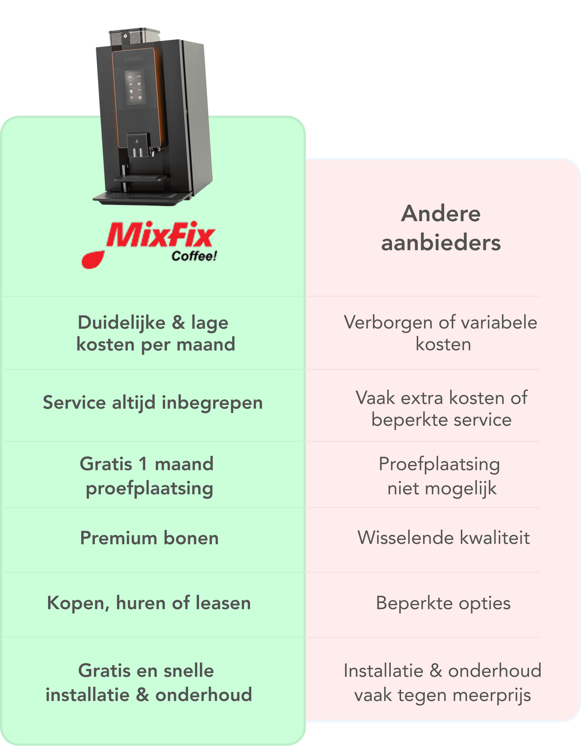 Bij ons krijgt u geen standaardoplossing, maar een koffiemachine die echt bij u en uw bedrijf past. Met transparante prijzen, persoonlijke service en natuurlijk topkwaliteit koffie. Ontdek zelf de voordelen van Mix-Fix: