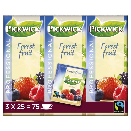 Pickwick Bosvruchten Fairtrade is een zwarte thee met bosvruchten; de Fruitthee varianten zijn 100% natuurlijke theemelanges op basis van zwarte thee en echte stukjes fruit. Verpakt in een volledig gesloten papieren envelop die bij het oud papier kan.
