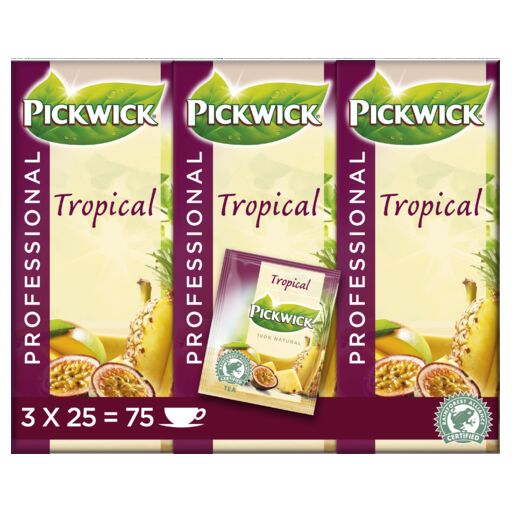 Pickwick Tropische Vruchten is een zwarte thee met een fruitig smaak palet van banaan, mango, ananas en passievrucht. De Fruitthee varianten zijn 100% natuurlijke theemelanges op basis van zwarte thee en echte stukjes fruit. De thee is verpakt in een volledig gesloten papieren envelop die bij het oud papier kan.